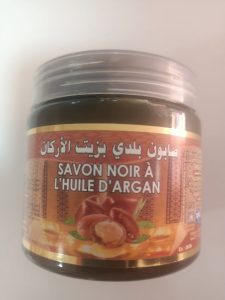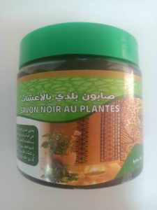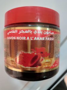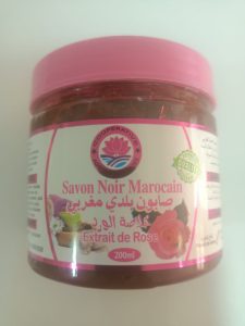 Savon Noir naturel marocain aux pétales de coquelicot et à la grenade, reconnu pour illuminer le teint et adoucir la peau.